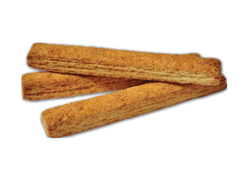 Изделие из слоеного сахарного теста специализированной рецептуры имеет сладко-соленый вкус с ароматом сыра, поверхность посыпана смесью крошки и соли. Структура слоеная, хрустящая.