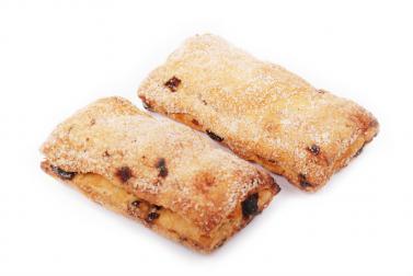 Печенье из бездрожжевого слоёного теста с добавлением изюма в виде прямоугольника с прижатыми краями, поверхность посыпана сахарным песком.